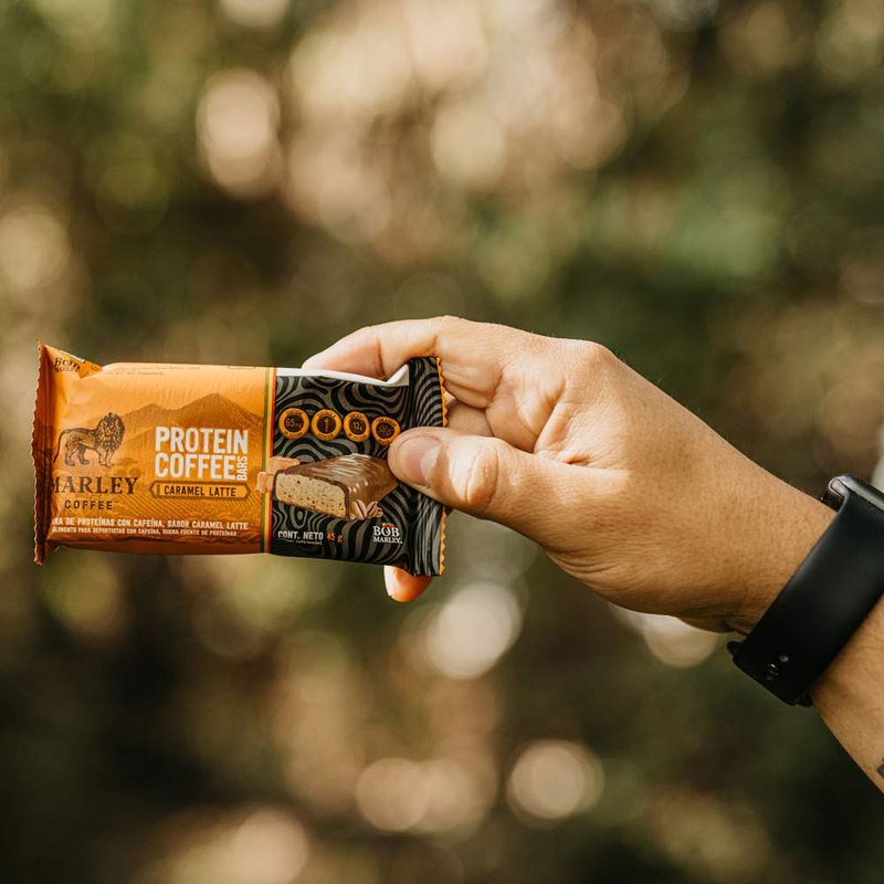 Marley Coffee. Cada barrita contiene 65 mg de cafeína natural —lo mismo que un shot de espresso— para activar tu día estés donde estés.